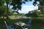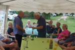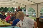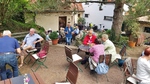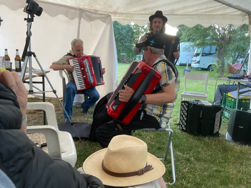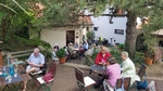 Ausschlafen ist angesagt. Nach dem Frühstück unternimmt jeder nach Lust und Laune Aktivitäten: im Liegestuhl, im Aufräumen oder in der Fortbewegung mit dem Fahrrad. Wir entscheiden uns für eine Radtour nach Friedenburg. Glatte Asphaltstraße - und das E-Bike läuft wie geschmiert. Entlang an kurzhalmigen Weizenfeldern, einige sind schon gemäht, weitläufigen Kartoffelfeldern und natürlich Mais im Überfluss. In Friedenburg, bei der abgebrannten Burg, begegnen wir Brigitte und Karl, die ebenfalls auf Sightseeing-Tour durch das Saaletal fahren wollten. Hier erfahren wir von ihnen, dass der Brand der Burg ein Versicherungsbetrug war. Die oder der Täter sitzen jetzt und „ruhen“ sich für eine lange Weile aus. Der Nachmittag verläuft für jeden anders. Es wird gelesen, natürlich im Schatten. Getränke fließen die Kehle herunter. Brigitte und Karl gehen schwimmen. Einige stehen - im gehörigen Abstand von 1,5m - im Kreis und tauschen Neuigkeiten aus. Es ist mal eine andere Form der Kommunikation. Natürlich wird jedes neu ankommende Vagabunden-Mobil herzlich begrüßt und ordnungsgemäß eingewiesen. Das Vergnügungszelt steht, Tische und Stühle warten auf die Vagabunden. Ja, die Kehlen lechzen nach einer bestimmten Flüssigkeit. Um 17:00h starten wir den Abend mit einem Sektempfang. Unser Vizepräsident Ulrich Nobbe (in Vertretung des Präsidenten Norbert Meik, der mit seiner Renate derzeit privat mit dem WoMo durch das warme Baltikum reist) begrüßt die angereisten Vagabunden, es haben alle die Anreise pünktlich geschafft. Ulrich lobt Mechthild und Uwe für die Wahl dieses idyllisch gelegenen Campingplatzes, das Programm der nächsten Tage verspricht uns viel Interessantes. Ulrich begrüßt zur Vagabundentaufe unsere neuen Freunde Heike und Rolf Lausecker (vom RC Stolzenau), er überreicht ihnen ein RVFE-Banner und Schilder und wünscht ihnen in diesem Kreise interessante Reisen und liebe neue Freunde. Heike und Rolf bedanken sich an den folgenden Abenden mit einem Umtrunk. Um 18:00h wird das Büfett eröffnet. Geräucherte Forelle aus der Zucht des Platzwartes, gegrilltes Fleisch, Kartoffelsalat, grüner Salat und viel Obst, beinahe zu üppig. Paul hat großzügiger Weise ein Fass Bier mit Zapfanlage gespendet. Geschmeckt hat alles sehr. Wolfgang spendiert uns allen noch einen Pflaumenschnaps. Gut, dass wir im Zelt sitzen, es regnet etwas. Aber die Stimmung ist gelungen.