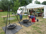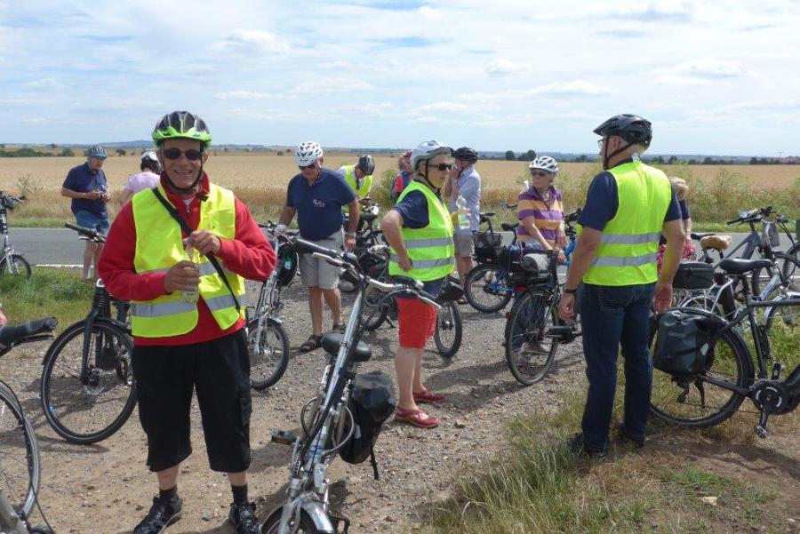 Heute beginnt der Brötchenservice um 8.00h. Es folgt ein gemütliches Frühstück. Um 11:00h startet die Radtour zum Weingut Born in Höhnstedt (Gemeinde Salzatal), 88m über dem Saaletal, insgesamt hin und zurück 34km. 21 fahren mit dem Rad (bis auf einen nur Pedelecs) und der Rest fährt mit dem Taxi. Gruppenfahren kann sehr unterhaltsam sein. Ich fahre hinten und kann genüsslich die Radlertruppe beobachten. Da schert doch einer aus, um mit dem Ehepartner zu plauschen, wieder will ein Radler schnell in eine Lücke, um zwei Plätze weiter zu kommen. Von hinten wollen Autos an uns vorbei, dabei ruft einer, nicht zu zweit nebeneinander, es ist nicht erlaubt. Herr Oberlehrer ( wer immer damit gemeint ist ) schimpft: einige müssen noch Kolonne fahren lernen! Raser gibt es natürlich auch in der Gruppe, sie sind nur noch ein Punkt am Horizont. Sehr clevere Radler haben eine Ersatzbatterie und ab geht die Fahrt geschwinde. Reserveenergie ist ja vorhanden. Es gibt ungeahnte Möglichkeiten beim Radfahren etwas falsch zu machen. Ich natürlich nicht. Ich fahre gefahrlos hinterher!!! Auf gefährlichen Kreuzungen steht Karl wie ein gelb gekleideter Zinnsoldat und lässt kein Auto vorbei. Wir können gefahrlos die Kreuzung überqueren. Dank an Dich, lieber Karl, dieses sollte Schule machen. Im Weingut Born angekommen werden verschiedene Saale-Unstrut-Weine verköstigt. Dazu gibt es Flammkuchen satt. Langsam beginnt sich der Himmel zu bewölken. Rauf auf die Räder und die Rückfahrt geht sowieso immer schneller. An einer Strecke geht es steil bergab. Paul fährt ca. 55 km/h, ich nur 35 km/h. Ich bin ja so vernünftig, sofort wird die Rücktrittbremse benutzt und ich fahre sicherer. Abends beim Grill liegt doch Ulrich fast in der glühenden Asche. Sein Südstaatlerhut (USA) fing Gott sei Dank kein Feuer, als die Flammen züngelten, außerdem schützte der Hut ihn vor dem beginnenden Regen. Ulrich, was hast Du bloß für eine großartige Aufgabe übernommen, uns mit Steaks, Putenfleisch und Bratwurst satt zu bekommen. In der Hitze und dem Regen hast Du alles bravourös gemeistert. Lieber Ulrich, wenn wir Dich nicht gehabt hätten, wir hätten alle hungrig ins Bett gemusst. Um 20:00h leitet uns der Vizepräsident durch das Vagabunden-Meeting zum Saaletaltreffen (siehe hierzu das gesonderte Protokoll des 1.Sekretärs im internen Teil der RVFE-Webseite). Der Abend klingt aus, ohne Schaden an Körper, Geist und Seele.