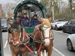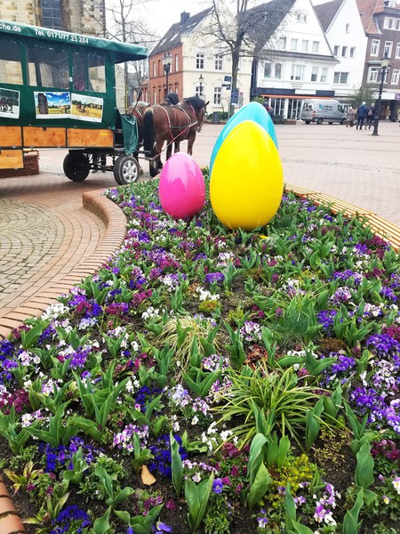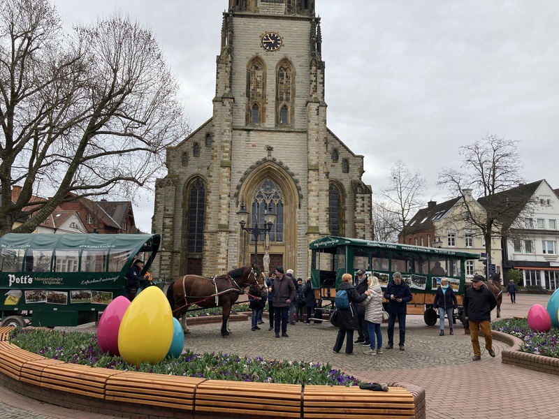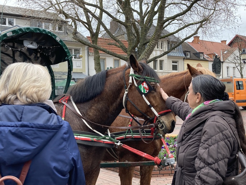 Nach individuellem Frühstück in den WoMos erwarteten uns pünktlich um 10:00 Uhr 2 zünftige Planwagen-Pferdekutschen, die uns – geschützt vor Wind und Wetter hinter Planen und Folienfenstern – zum Oelder Marktplatz brachten, wo uns dann eine sehr nette Stadtführerin zu einem ca. einstündigen Stadtrundgang empfing.