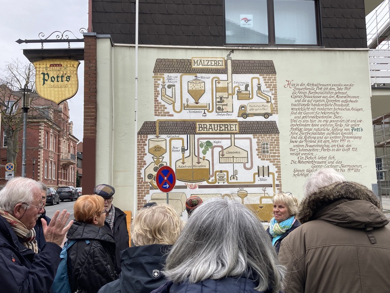 Des weiteren erfuhren wir von ihr Daten zur Geschichte Oeldes seit Karl dem Großen bis in die Neuzeit und Fakten zur wirtschaftlichen Bedeutung der diversen Brennereien (Schwarze aus Oelde und die im Jahre 1990 übernommene Steinhägerbrennerei Schlichte aus Steinhagen) und der familiengeführten Pott´s Brauerei. Wir hatten Gelegenheit zur kurzen Besichtigung eines der ältesten Oelder Fachwerkhäuser aus der Zeit vor dem letzten großen Stadtbrand 1800 – heute innen ein gemütliches italienisches Restaurant. Den Abschluss des Stadtrundgangs bildete eine kurze Führung durch die katholische St. JohannisStadtkirche.